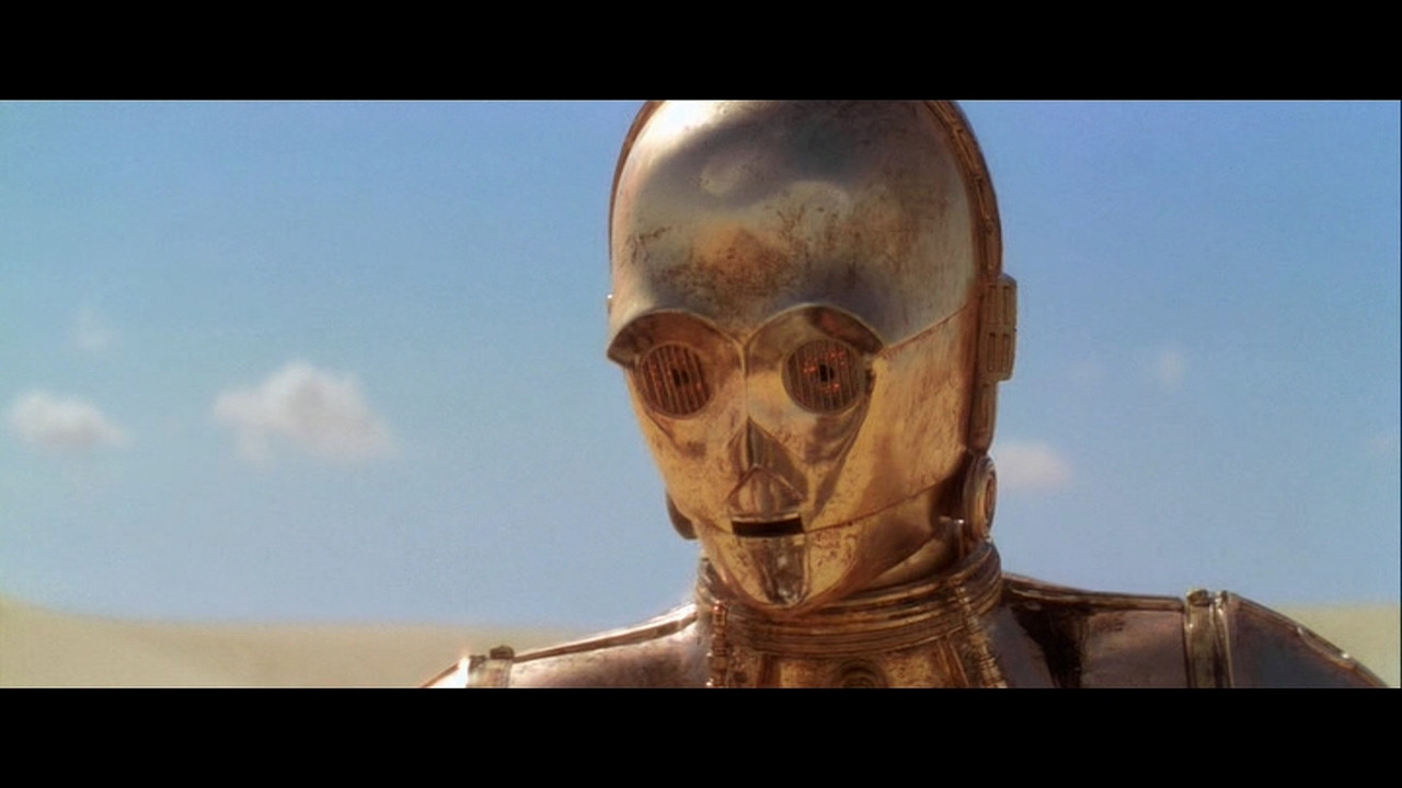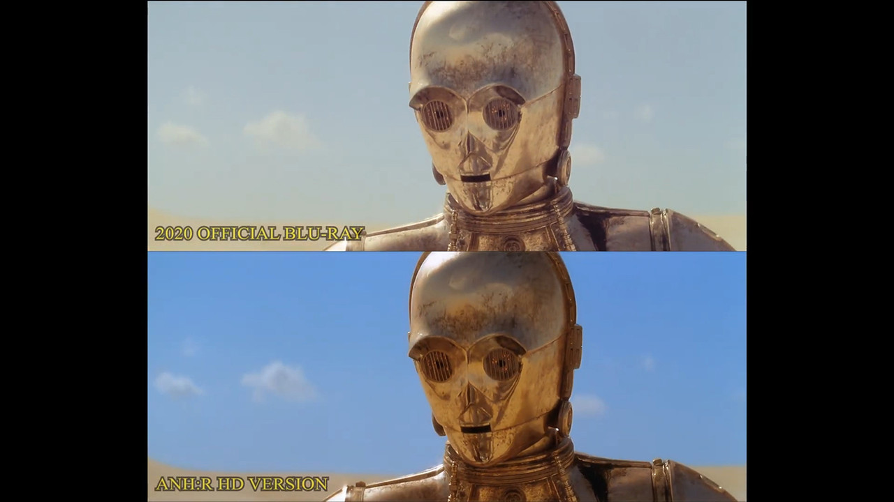 Let me first say I really do like the pretty, vibrant blue skies! That rich blue is striking and really pops against the sand, better than the Official’s mostly-colorless sky for sure. But… there is also the other part of me that thinks it could actually be too rich of a blue for Tatooine skies (most notably during the “Look sir, droids” and the sand crawler shot after that). Hear me out. Imagine if this blue hue were, overall, dialed down to be more of a light-blue with a slight hint of cyan, like how it was in the original Revisited, as a perfect example: