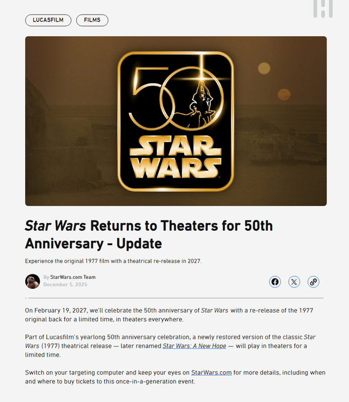 “Part of Lucasfilm’s yearlong 50th anniversary celebration, a newly restored version of the classic Star Wars (1977) theatrical release — later renamed Star Wars: A New Hope — will play in theaters for a limited time.“